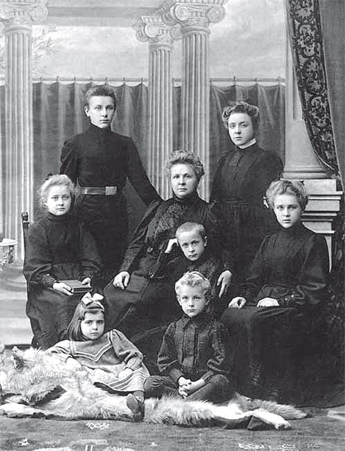 Семья Булгаковых в трауре по А.И.Булгакову. 1907 г. Сидят на полу: Лёля, Ваня; второй ряд: Варя, Варвара Михайловна с Колей и Надя; стоят: Миша и Вера