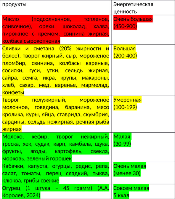 Упрощенная таблица калорийности продуктов на 100,0 (по типу Светофора)