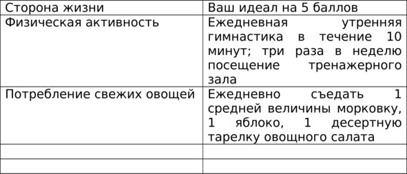 Для анализа сторон жизни влияющих на ваш вес заполните таблицу, в которой вы укажете ваши стороны жизни и тот идеал к которому надо стремится и выполнять. В ней предлагаются примеры.