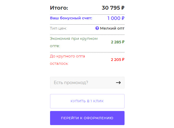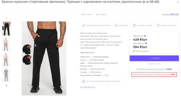 А в карточке товара можно вывести экономию от покупки крупным оптом в пересчете на единицу. Оптовики, как правило, умеют хорошо считать свою выгоду и после закупки пробной партии начинают брать крупным оптом, увеличивая свою конечную прибыль.