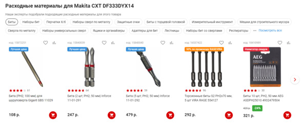– Категорийное соответствие: мы знаем, что с товарами категории «шуруповерты» клиенты покупают товары категорий «биты» и «сверла». Для каждого товара из шуруповертов мы показываем любые биты и сверла.