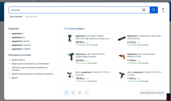 На примере ниже представлен результат поиска по части слова. Мы видим, что кроме непосредственно товаров покупателю предлагаются товарные категории, а также поисковые подсказки, которые вводились клиентами ранее.