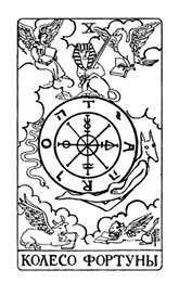 На карте изображена судьба в виде колеса, которое одних возносит на вершину бытия, а других низвергает – чье-то время приходит, чье-то уходит. Также она символизирует предопределенность, фатум, внешнее влияние на ход событий.