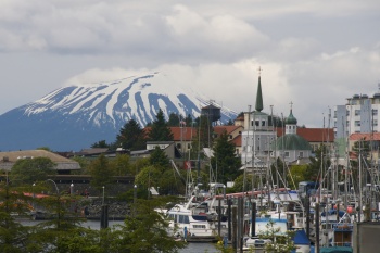 Ситка (бывшая столица Русской Америки на Аляске – город Ново-Архангельск). Вид на порт, русскую православную церковь Св. Михаила Архангела (1848) и вулкан Эджкомб (976 м.)