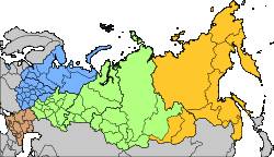 Военные округа России с 1 декабря 2010 года: Западный военный округ (синий цвет), Южный военный округ (коричневый цвет), Центральный военный округ (зеленый цвет), Восточный военный округ (желтый цвет).