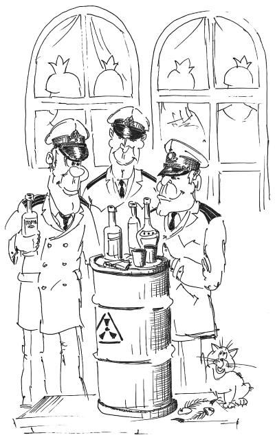 Начинаем заливать бочки внутрь подводной лодки. Гидравлика замёрзла и течёт неохотно, тоненькой и ленивой струйкой. Мы с Борисычем поддерживаем бочку с боков, чтоб она не кульнулась, а Толик – сзади, чтоб тоже типа что-то делать. Из дивизии приходит командир, подходит к нам и молча стоит, любуется на нашу слаженную работу. Конечно, это красиво, когда два человека с высшим образованием и один со среднетехническим заливают гидравлику из бочек внутрь. Минут пять стоял молча, потом вздохнул:
