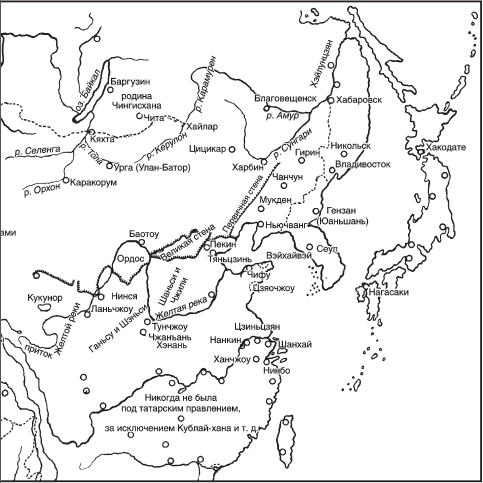 Нет необходимости рассматривать ранние сведения о татарских войнах, описание которых довольно смутно. Достаточно сказать, что с 1400 г. до н. э. до 200 г. н. э. встречаются краткие упоминания о столкновениях китайцев с кочевниками. В каждом случае называются приблизительные даты, поэтому эти сведения вполне можно считать историческими. Следует, однако, помнить, что ежегодная датировка китайской истории начинается лишь с 828 г. до н. э. Северные районы провинций, ныне известных как Шаньси, Шэньси и Чжили[1], находились тогда во власти кочевников. На протяжении многих столетий, во время так называемого периода «сражающихся царств», силой кочевники не уступали Китаю. Император Китая, как и его беспокойные вассальные царьки, в разные периоды заключали брачные союзы с правящими семействами кочевников, и по крайней мере один китайский властитель сознательно заимствовал татарский костюм и образ жизни. Теперь возникает другой этимологический вопрос, а именно: имеет ли китайское слово «тунг-ху», или «восточные татары» (термин так же часто применяемый к предкам катаев, маньчжуров и корейцев, как название «хунну» употребляется в отношении предков тюрков, уйгуров, киргизов и т. п.), какую-либо этимологическую связь с европейским словом «тунгус». Если два этих слова никак не связаны между собой, значит, перед нами чрезвычайно любопытное совпадение, поскольку оба слова и в русском, и в китайском языках имеют одинаковое значение. В источниках упоминается и другой случай, который призван показать, что приграничные государства Китайской империи были глубоко затронуты татарским влиянием. У одного из вассальных владык был кубок, сделанный из черепа правителя– соперника, – факт столь же противоречащий конфуцианским идеям, сколь соответствующий всему, что мы знаем об обычаях хунну и скифов. В конце III века до н. э., непосредственно перед тем, как западному царству Цинь удалось разрушить старую феодальную систему и объединить Китай в единую империю, вассальное государство, под властью которого находились теперешние провинции Шаньси, Шэньси и Чжили, оказывало систематическое сопротивление вторжениям кочевников и в конце концов вынудило татарского царя вступить в открытое сражение, в ходе которого татарские войска были наголову разбиты. Потери татар составили 100 000 человек. После этого император Цинь присоединил это государство к остальным, а прославленный военачальник Мэн Тянь во главе нескольких сотен тысяч воинов был отправлен в поход на татар. Ему удалось отвоевать Желтую реку (Хуанхэ) на всем ее протяжении, включая участок излучины, теперь известный как плато Ордос. Татары были оттеснены к северу от Великой степи. Бесчисленные отряды преступников и других горемык были направлены на север для строительства военной дороги и несения гарнизонной службы. Вдоль границы было возведено около сорока крепостей и укрепленных городов. Наконец, от окрестностей современной столицы провинции Ганьсу – города Ланьчжоу – до моря протянулась Великая стена. Поскольку она отмечена почти на всех современных картах Китая, читатель облегчит себе задачу, если будет держать перед глазами такую карту. Это избавит нас от необходимости приводить многочисленные и причудливые китайские географические названия – а также и имена, которые часто варьируются в зависимо