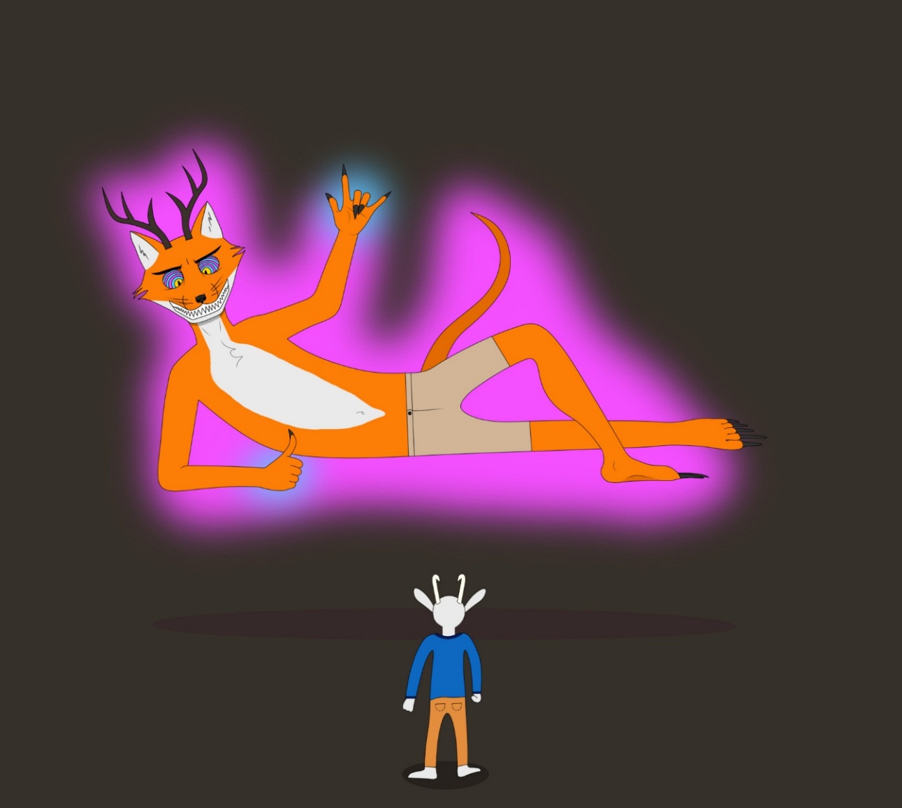 Сон. Вокруг темно. Этот сон, который происходил в его голове глубокой ночью, протекал спокойно и был бы обычным, как всегда, если не одна «задорная» деталь. Вдруг из ниоткуда появилось странное существо. Оно лежало и парило над черной поверхностью в темноте, окруженным легким фиолетовым свечением. Это существо было похоже на человекообразного лиса с жёлтыми хищными глазами и оленьими рогами. Вдобавок ко всему у него был хвост как у ящерицы, но только пушистый. Улыбка была широкая и искренняя как у чеширского кота. Риаз отнёсся к этому совершенно спокойно. Это ведь всего лишь сон.