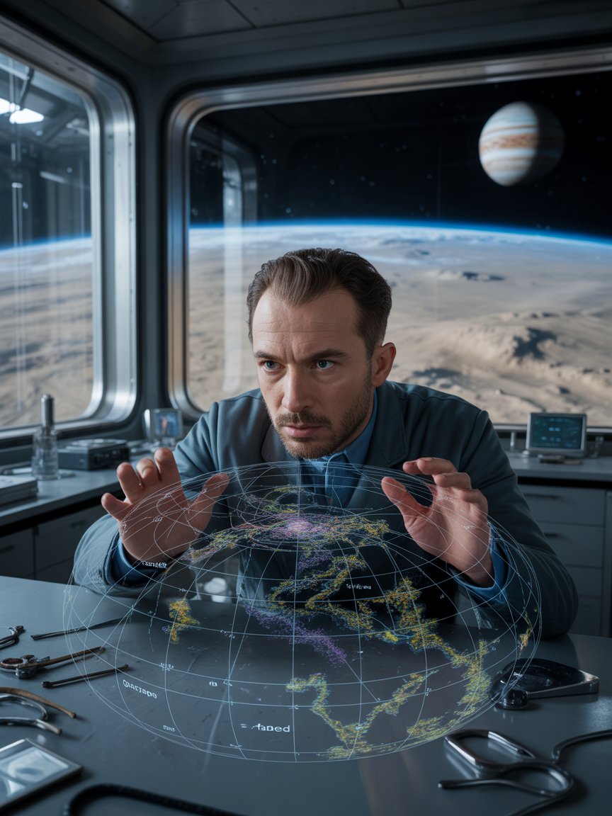 Он откинулся в кресле, позволяя образам и числам течь сквозь его сознание. Орбитальная исследовательская станция, где располагалась его лаборатория, совершала очередной виток вокруг Ганимеда. Свет далекого Солнца, ослабленный расстоянием, проникал через панорамное окно, создавая причудливые тени среди голографических проекций.