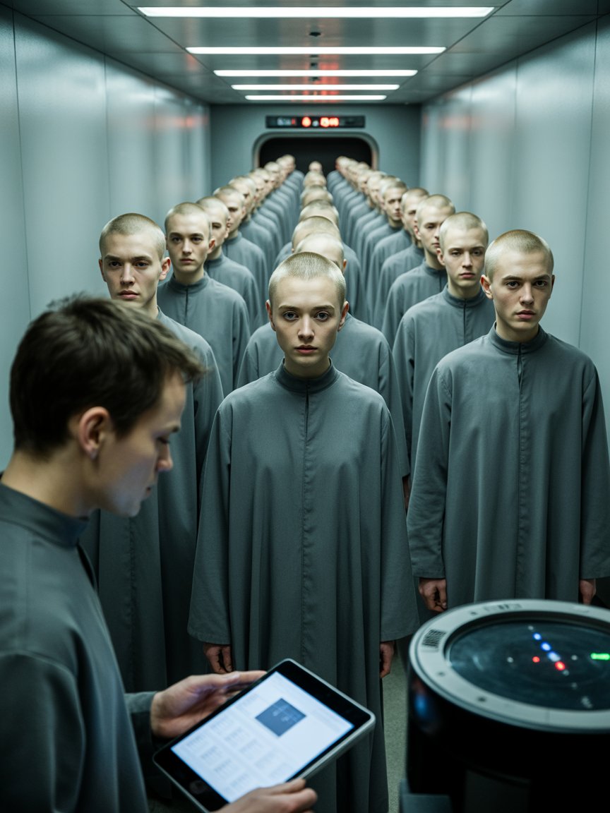 Последними из транспорта вышли восемь единиц с маркировкой Е. Внешне они не отличались от остальных – такие же бритые головы, серые робы, пустые глаза. Но было что-то в их движениях… более плавное, более координированное.