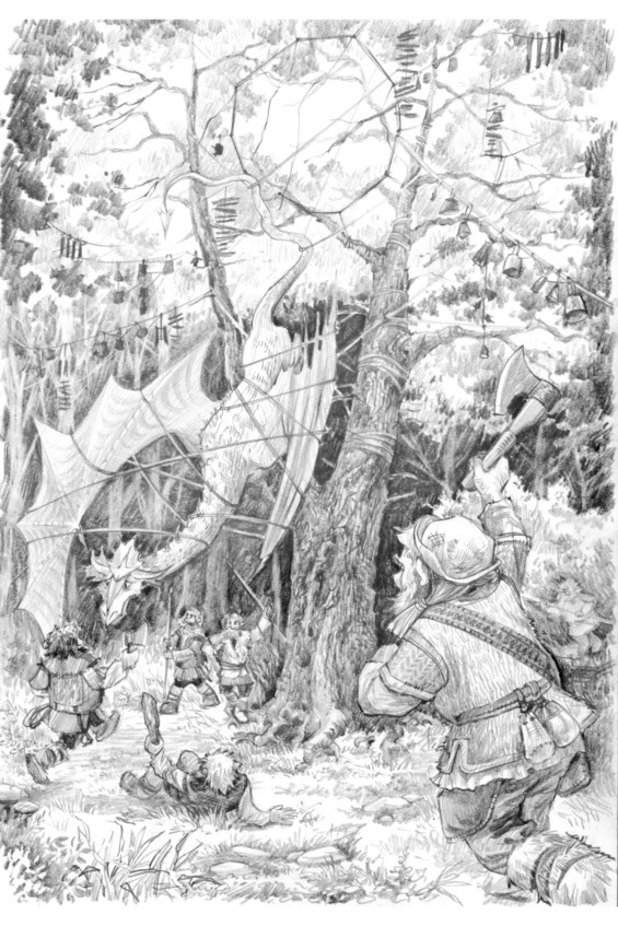 Поднялся страшный шум: зазвенели сигнальные колокольчики, загремели старые ведра, затрещали трещотки. На шум сбежались жители ближней деревни, вооруженные кольями и топорами. Это были колбасные грызли. Вообще-то нрав у них добродушный. Они с древних времен строят свои деревни на земле эльфов и поддерживают с ними добрососедские отношения. Однако для драконов они представляют некоторую опасность, поскольку очень любят готовить колбасу из их хвостов. Хотя хвосты у драконов отрастают быстро, они очень не любят попадать в ловушки. Дракон без хвоста вынужден сносить насмешки сородичей. Для их самолюбия это тяжелое испытание.