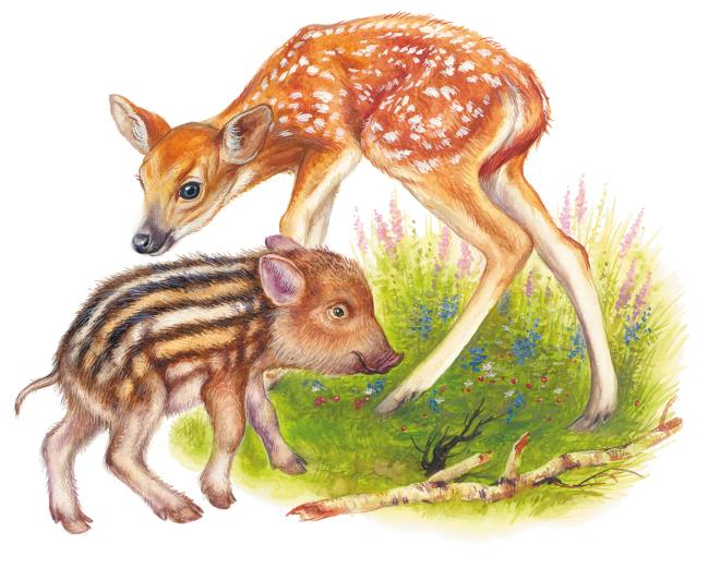 Встре́тились на поля́не дво́е малыше́й: Косулёнок – лесно́й козлёночек и Каба́нчик – лесно́й поросёнок.