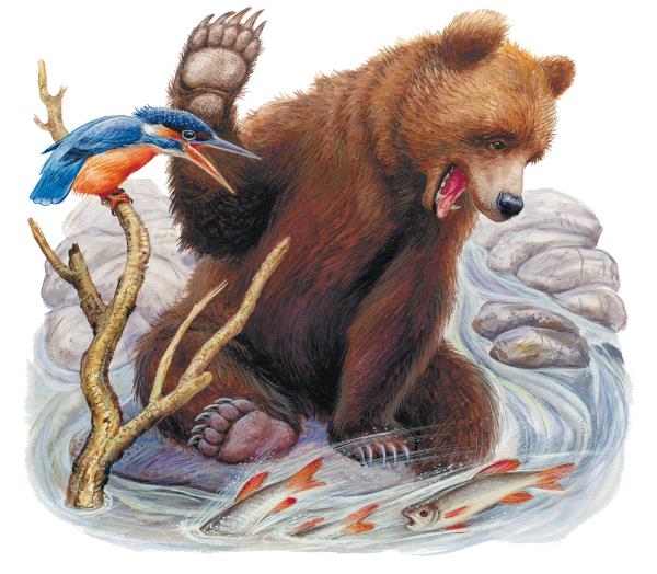 На лесно́й реке́, на круто́й излу́чинке Медве́дь ры́бу ло́вит. Сиди́т на большо́м ка́мне, ла́пу вверх задра́л – ждёт.