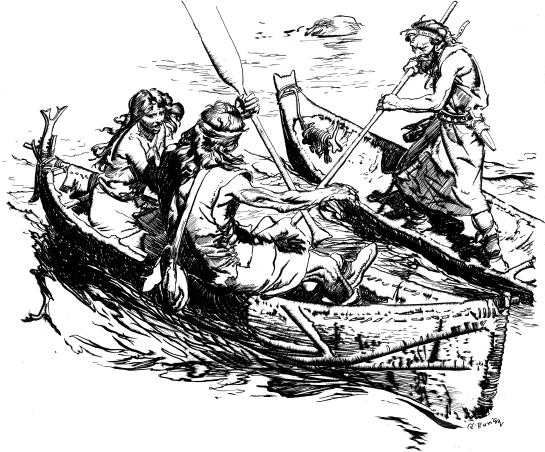 Кое-кто из Медведей выбежал на берег, заинтересовавшись зрелищем. Молодой Олень храбро работал веслом, но Кривой Рот сильно отталкивался от дна длинным шестом, быстро сокращая расстояние между лодками.