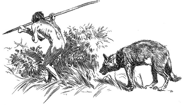 Копчем вздрогнул от неожиданности, и волк спрятался. На помощь мальчик звать не стал – он уже большой! – а тихо встал и огляделся по сторонам в поисках какого-нибудь оружия. Увидел несколько копий, воткнутых в землю. Взял одно и собрался уже вернуться обратно к кусту, но тут Лохмач – старый, однако же сильный и ловкий охотник – бросил ему хорошую необглоданную кость. Мальчик поймал ее левой рукой и пошел искать волка. Он несколько раз куснул мясо, оглядывая высокую траву за зарослями ольхи. Волка нигде не видно. Копчем пошел дальше по берегу… И тут – шелест, прыжок… Волк, мелькнув в траве, мгновенно выхватил кость из руки Копчема.