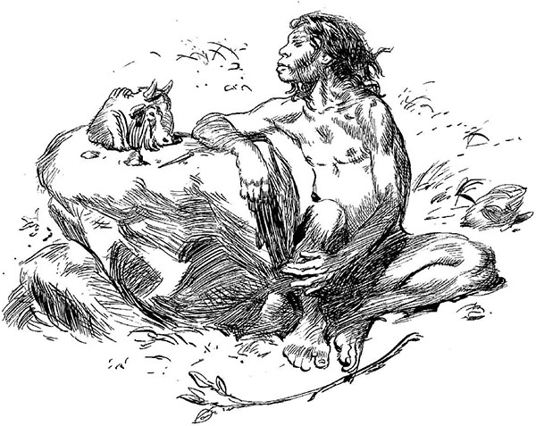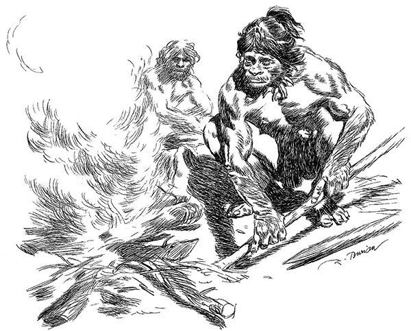 Вдруг Копчем захныкал и ухватился за длинную тлеющую ветку. Отойдя в сторонку, он принялся старательно дуть на нее. Только тогда все племя заурчало, хваля Копчема: ведь они чуть было не позабыли сохранить огонь! Хорошо, что Копчем спас его! Умный парень!