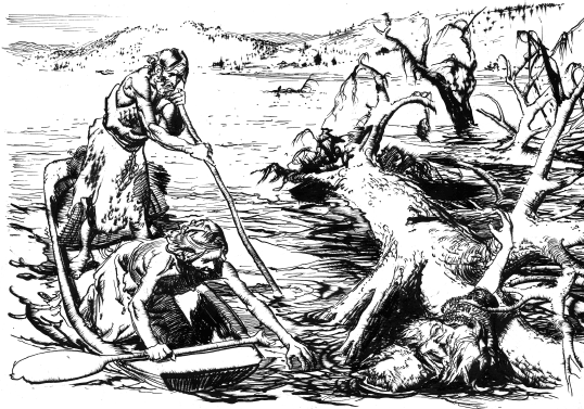 Ворчун бросил шест в лодку, схватил человека поперек туловища и втащил внутрь. При этом воды в вертком челноке прибавилось, так что он едва не потонул. К счастью, суденышко застряло между толстыми сучьями, и это его спасло.