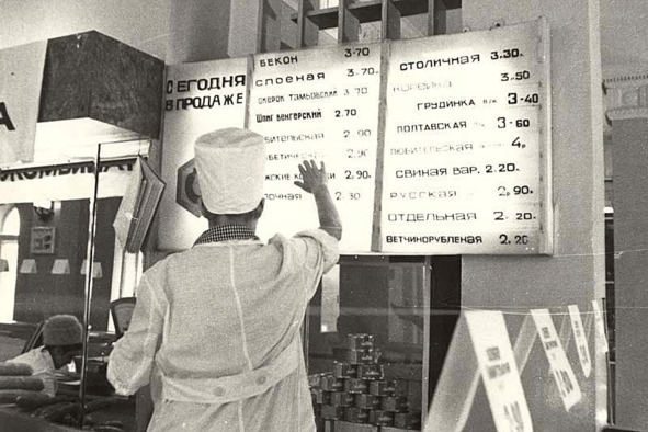 Цены на колбасу в 1983-м году. Если учесть, что оклад инженера был тогда 120 рублей, то вроде бы и ничего. Но такого ассортимента сразу в одном месте автор не помнит даже в столице. Фото из архива
