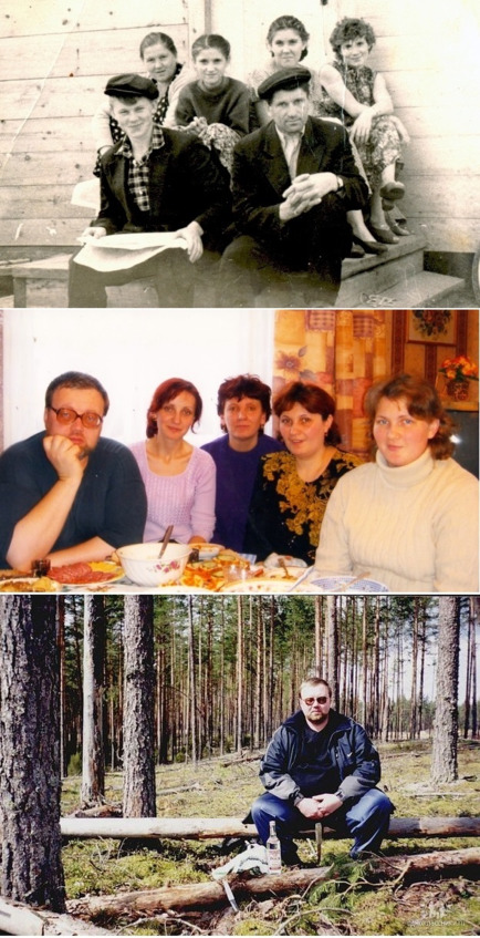 Вверху фото семьи отца в 1962 году, посредине – брат и сёстры зимой 2005 года, внизу – сбор грибов-вешенок в мае 2004 года.