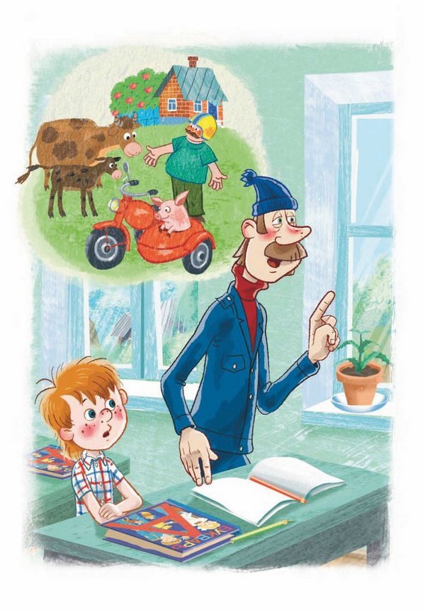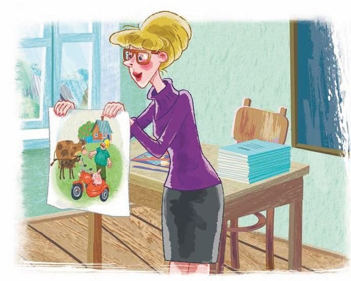 Она показала картинку. На ней был нарисован зелёный лужок, рыжая корова с телёнком, красный домик, усатый дядя в шлеме и мотоцикл с коляской. А в коляске сидел поросёнок.