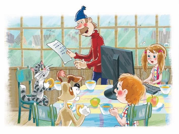 В этот раз занимающимся сильно повезло. На улице лил капустный дождь, и ничто не отвлекало Матроскина, Шарика, дядю Фёдора и Печкина от занятий.