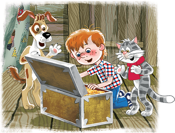 И тут у дяди Фёдора лопата как звякнет обо что-то – а это сундук окованный. А в нём всякие сокровища и монеты старинные. И камни драгоценные. Взяли они этот сундук и домой пошли. А навстречу им почтальон Печкин спешит.