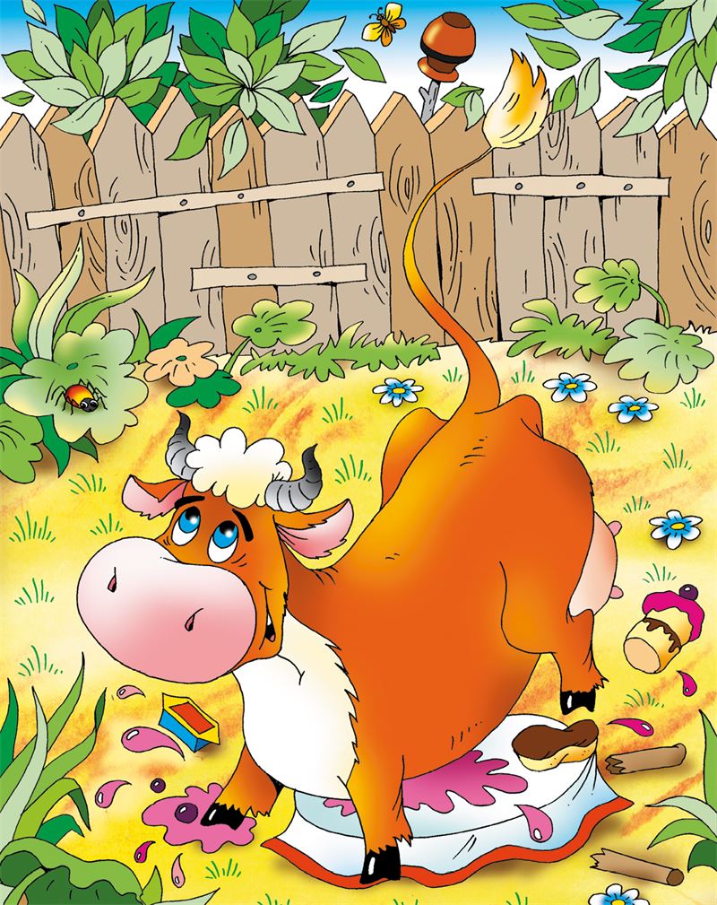 Они всё учли: и венок, и пирожные, и музыку. Но не учли того, что корова Мурка всю зиму в тёмном сарае без всякой зарядки простояла. Увидела она зелёный луг, синее небо и жёлтое солнышко и стала, как молодой телёнок, прыгать и скакать.