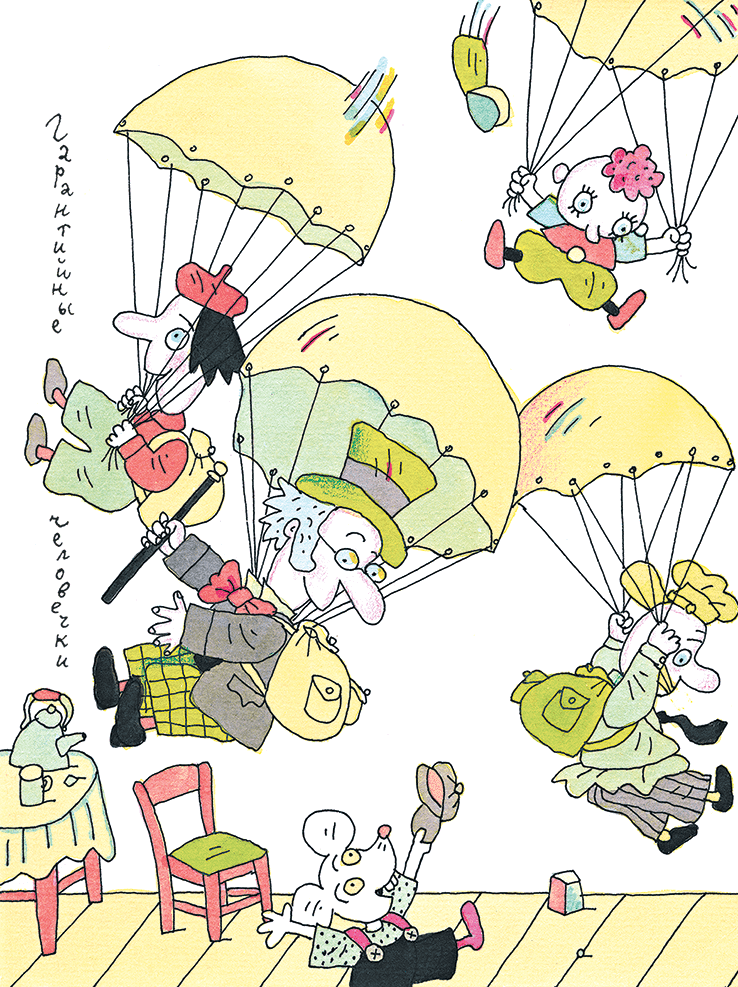И тотчас в холодильнике, в часах и в радиоприёмнике раскрылись двери, и на пол стали спускаться гарантийные человечки. В руках они держали фонарики.