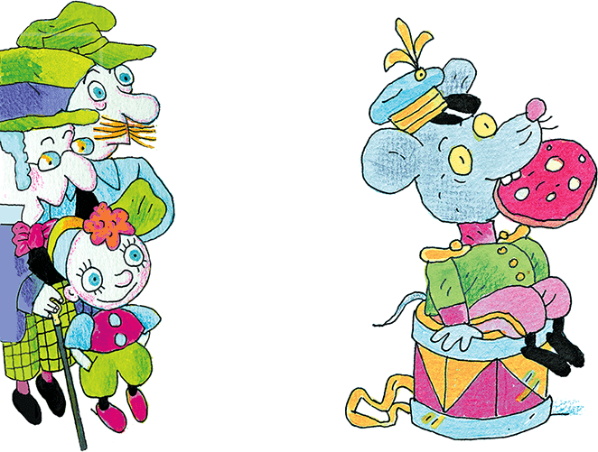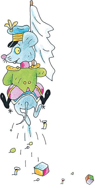 И точно: в углу послышался писк, какая-то возня, и из норки на пол выбрались два серых мышонка. Они деловито отряхнулись, вытащили из норки белый флажок и барабан, построились в шеренгу и пошли. Под барабанный бой они подошли к человечкам и остановились.