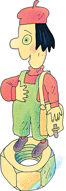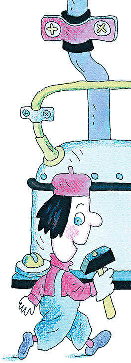 Вдруг сквозь щель облицовочной решётки из холодильника выбрался на пол маленький человечек несколько странного вида. За спиной у него висел газовый баллончик, как у аквалангистов, а на руках и ногах были надеты большие резиновые присоски.