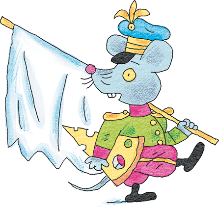 Вернулся Холодилин с высоким мышонком. Кажется, они основательно подружились. Под мышкой «серый герой» держал кусок сыра, а в свободной лапе – кружок колбасы. Поэтому он никак не мог ухватить белое переговорное знамя. Тогда он сунул колбасу в рот своему помощнику и строго приказал: