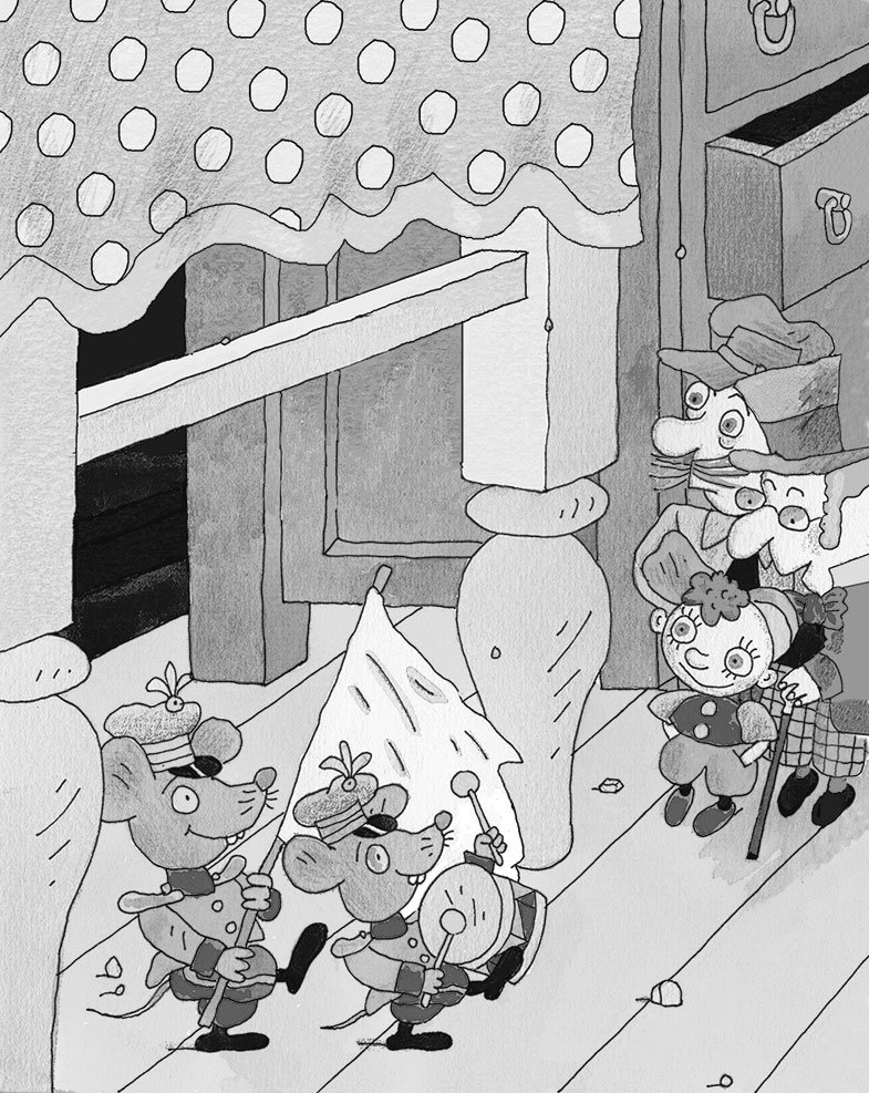 И точно: в углу послышался писк, какая-то возня, и из норки на пол выбрались два серых мышонка. Они деловито отряхнулись, вытащили из норки белый флажок и барабан, построились в шеренгу и пошли. Под барабанный бой они подошли к человечкам и остановились.