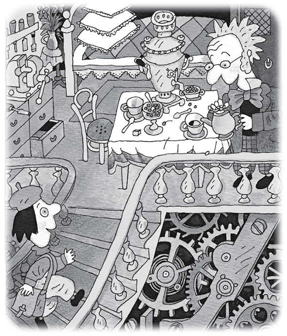 Лесенка привела их к большой площадке-комнате. Там посредине стоял стол с самоваром. У одной стены была кровать с горой подушек, а у другой – верстак с блестящими белыми инструментами и всякими латунными приспособлениями. В комнате было очень чисто и всё как-то очень продумано.
