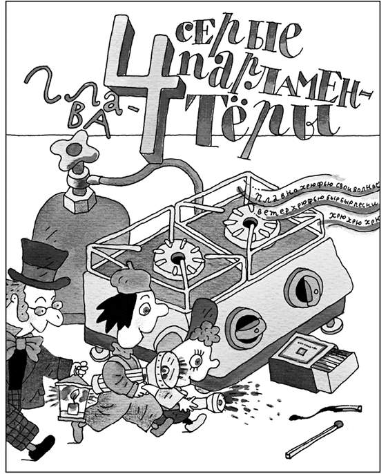 Вот распахнулось окно в часах, и кукушка Машка старательно прокуковала полночь. И тотчас в холодильнике, в часах и в радиоприёмнике раскрылись двери, и на пол стали спускаться гарантийные человечки. В руках они держали фонарики.