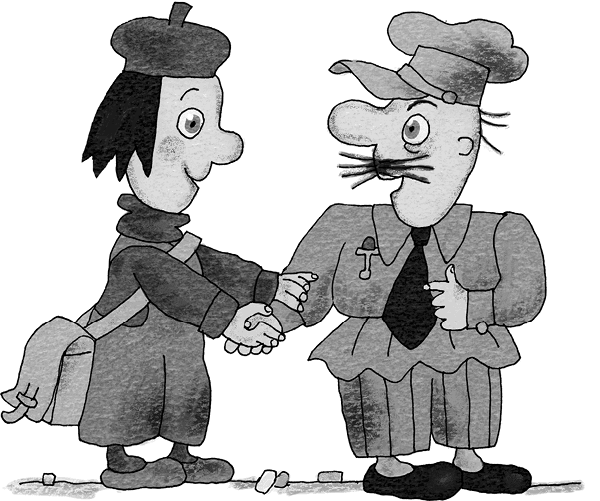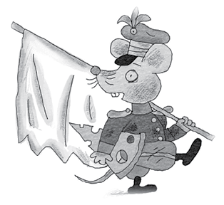 Вернулся Холодилин с высоким мышонком. Кажется, они основательно подружились. Под мышкой «серый герой» держал кусок сыра, а в свободной лапе – кружок колбасы. Поэтому он никак не мог ухватить белое переговорное знамя. Тогда он сунул колбасу в рот своему помощнику и строго приказал: