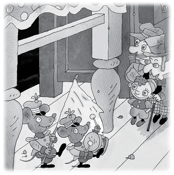 И точно: в углу послышался писк, какая-то возня, и из норки на пол выбрались два серых мышонка. Они деловито отряхнулись, вытащили из норки белый флажок и барабан, построились в шеренгу и пошли. Под барабанный бой они подошли к человечкам и остановились.