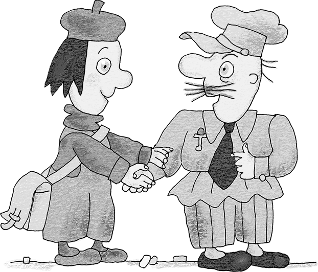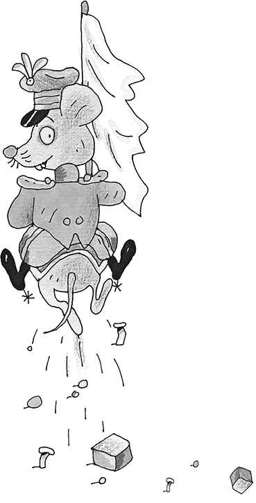 Вернулся Холодилин с высоким мышонком. Кажется, они основательно подружились. Под мышкой «серый герой» держал кусок сыра, а в свободной лапе – кружок колбасы. Поэтому он никак не мог ухватить белое переговорное знамя. Тогда он сунул колбасу в рот своему помощнику и строго приказал: