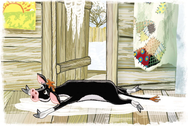 Матроскин молоко пролил, и в доме скользко. Мы-то привыкли, а другим трудно. Телёнок Гаврюша в дом вошёл, ноги разъехались, он второй день в сенях лежит. Он тяжёлый, его не поднять. Мы его в доме сеном кормим.