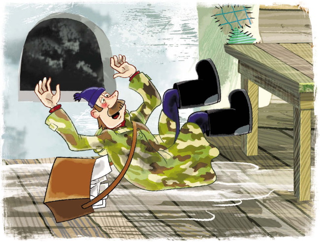 Почтальон Печкин вошёл, поскользнулся и сразу под стол въехал. Очень смешно. Лежит сердится. Говорит: «Правильно вы дверь не закрываете. На улице теплее, чем у вас. Пусть к вам тепло с улицы идёт».