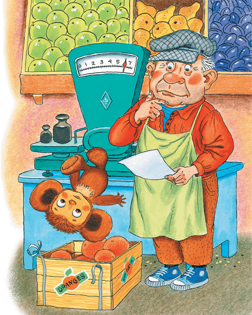 Ящики долго плавали по морям и океанам и в конце концов оказались во фруктовом магазине очень большого города. Когда их открыли, в одном апельсинов почти не было, а был только толстый-претолстый Чебурашка.