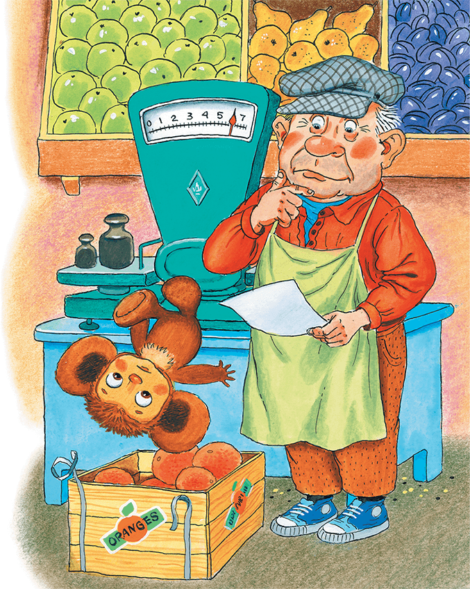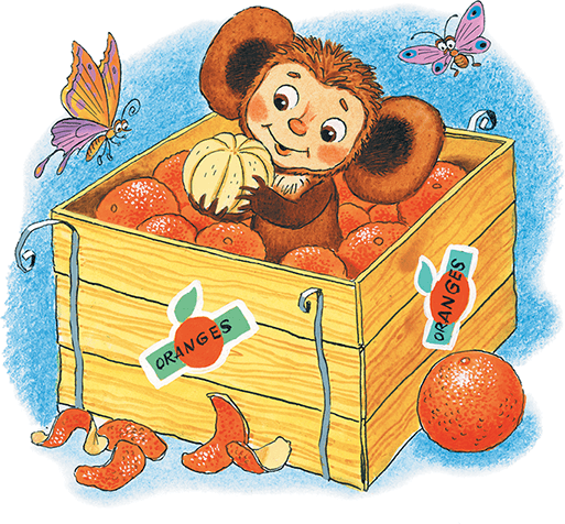 Ящики долго плавали по морям и океанам и в конце концов оказались во фруктовом магазине очень большого города. Когда их открыли, в одном апельсинов почти не было, а был только толстый-претолстый Чебурашка.