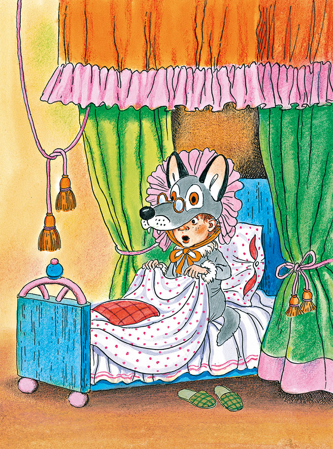 Дальше он, как положено, прибежал к домику, съел бабушку Красной Шапочки и лёг вместо неё в кровать.