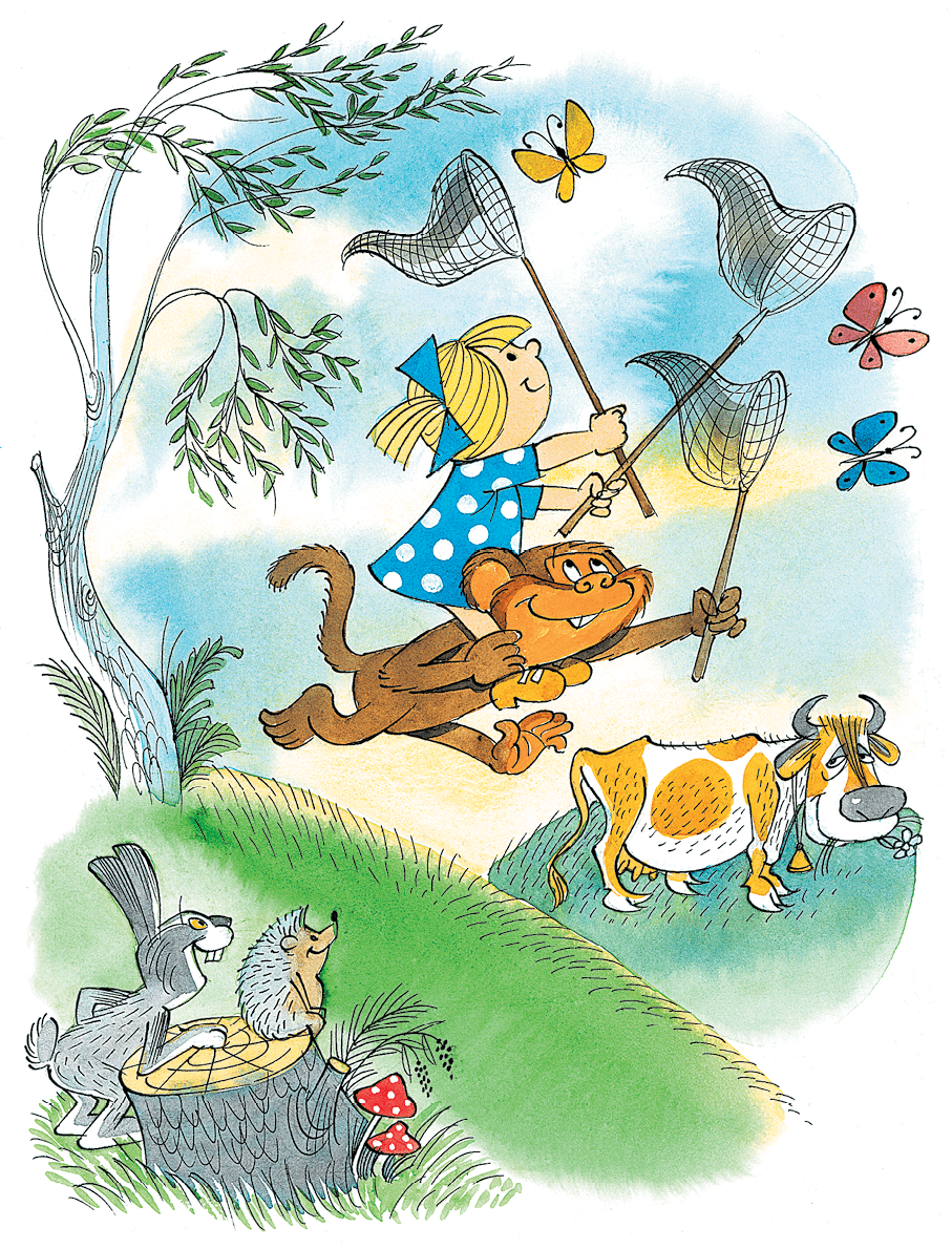Папа принёс обезьянку домой. Дома никого не было. Потому что мама была на работе, а Вера с бабушкой во дворе на качелях качались. Папа пошёл их звать.