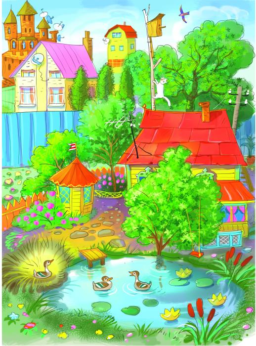 Девочка Оля жила в маленьком доме. Дом был маленький, но около него был маленький прудик. А в прудике жили утка с селезнем. Однажды эта утка села на гнездо высиживать яйца.