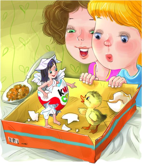 Через двадцать один день утята стали вылупляться. А два яйца никак не раскалывались. И утка всё на них сидела. Наконец они оба треснули, и появились два утёнка. Только один утёнок был утёнок, а второй не утёнок, а какой-то маленький человечек.