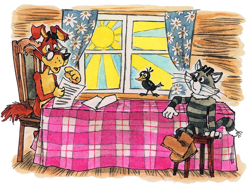 Он к этой работе Матроскина привлёк и Шарика. Они сидели втроём и размышляли, и составляли список.