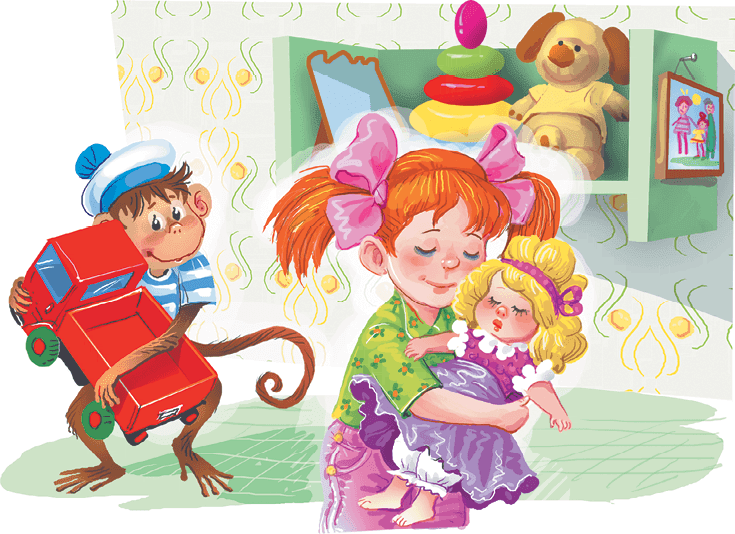 Бабушка в комнату заглянула. Видит – Вера ходит, большую куклу Лялю укачивает. А за ней по пятам Анфиса ходит и большой грузовик качает.