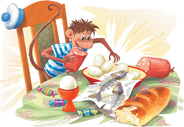 Обезьянка как начнёт есть! Сначала колбасу, потом хлеб, потом варёную картошку, потом сырую, потом селёдочные очистки в бумажке, потом варёное яйцо в скорлупе прямо со скорлупой.