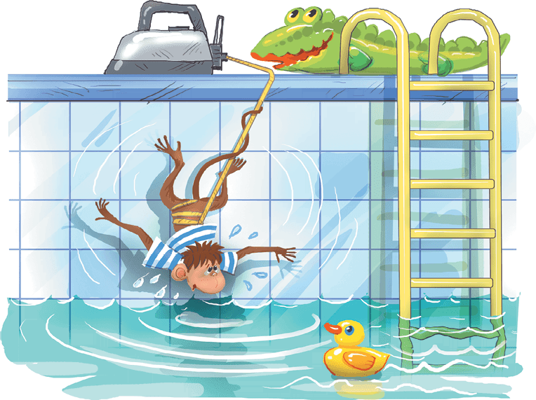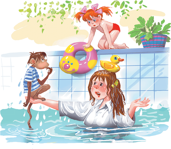 Анфиса тоже в воду захотела. Она к краю бассейна подошла и как свалится вниз! Только она до воды не долетела. Её утюг не пустил. Он на полу лежал, и шнур до воды не доставал. И Анфиса около стенки болтается. Болтается и плачет.