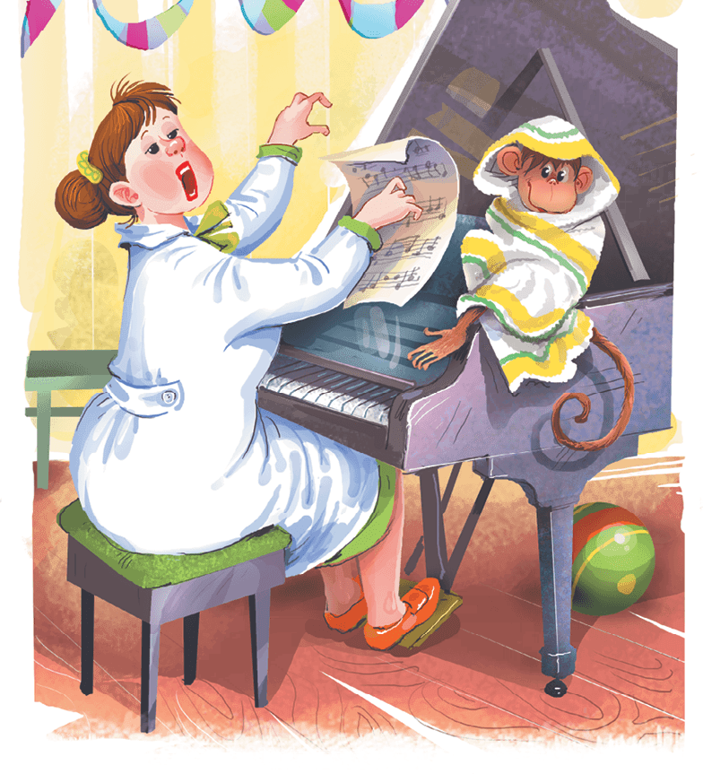 Пришли в музыкальную комнату. Дети встали на длинную лавочку. Елизавета Николаевна села на музыкальную табуретку. А Анфису, всю спелёнутую, посадили на край рояля, пусть сохнет.